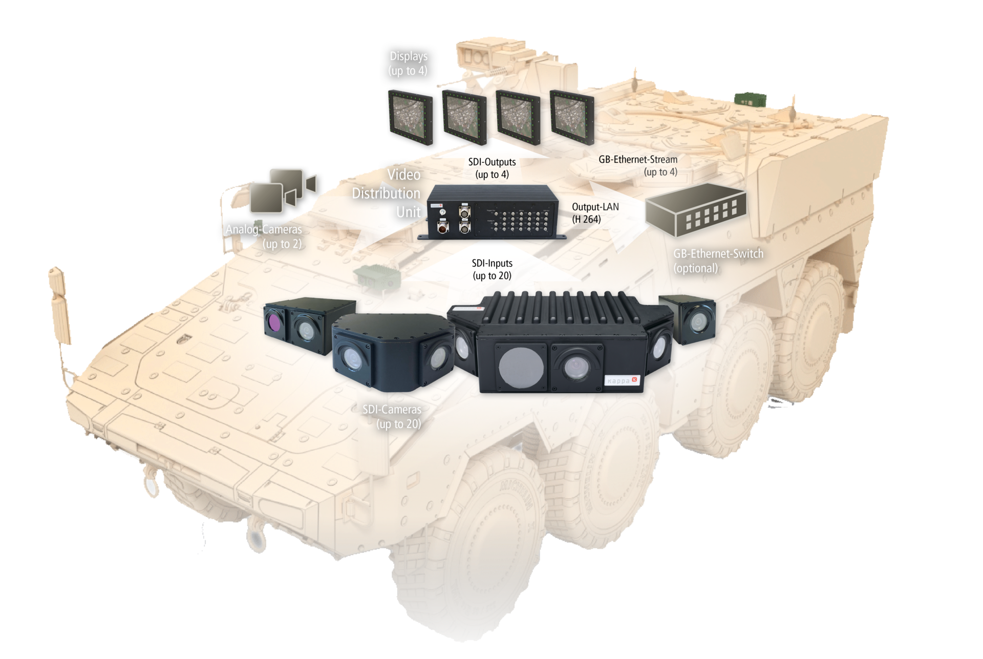 Die Armor Eye Produktfamilie von Kappa bietet ein Höchstmaß an Flexibilität für kunden- und programmspezifische DVE und SAS Designs und Integrationen. Die leistungsstarken robusten Bildverarbeitungslösungen können je nach Fahrzeugtyp und Missionsaufgaben spezifisch konfiguriert werden. Wir bieten erschwingliche Entry Level (EL) und sehr empfindliche und hochdynamische High Quality (HQ) Kameraprodukte. Profitieren Sie von unserer projektspezifischen Flexibilität zur Anpassung von Blickwinkeln und DRI-Leistung für die beste operative Leistung, Tag und Nacht 24/7.
