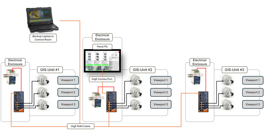 Unser System ermöglicht die vollständige visuelle Überwachung von Schaltstellungen. Mehrere Kameras sind direkt an den Viewports der GIS-Units installiert und liefern Full-HD-Livebilder über ein robustes GigE-Netzwerk. Die Kameras werden über Power over Ethernet (PoE) betrieben und sind mit GigE-Switches verbunden, die in geschützten Verteilerschränken untergebracht sind.