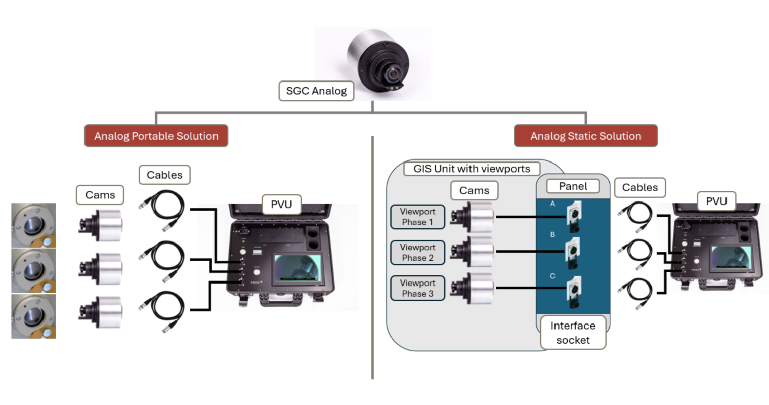 The static solution is designed for permanent operation in switchgear installations. The cameras are permanently mounted at the viewports of GIS or hybrid switchgear and connected to the PVU via an integrated interface. This setup provides continuous visual monitoring of switching positions and is ideally suited for installations that require permanent supervision.
